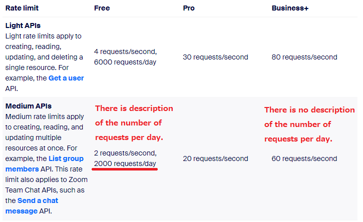 For example, if you use the Medium API with a Business + account, the rate limit is only 60 requests per second, but the user level limit for Indicated by the yellow line in the image (100 meetings can be created and updated per day) affects that, so the same user cannot create more than 100 meetings per day.