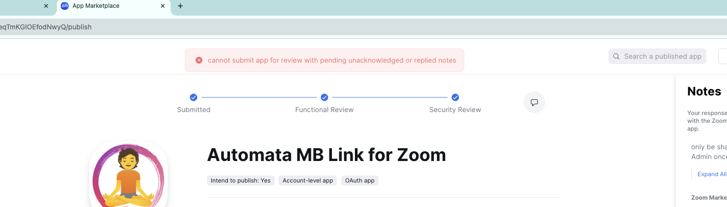 Now when I try to submit, I get an error toast that says “cannot submit app for review with pending unacknowledged or replied notes”. I looked at the notes, and none let me reply.