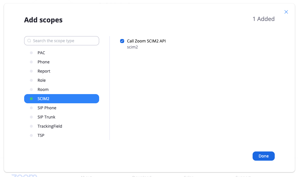 To make these requests with OAuth, create an Account-level OAuth App and add the SCIM2 scope to the app. This app will then need to be installed and used by an admin or account user with Single Sign-On edit permissions.