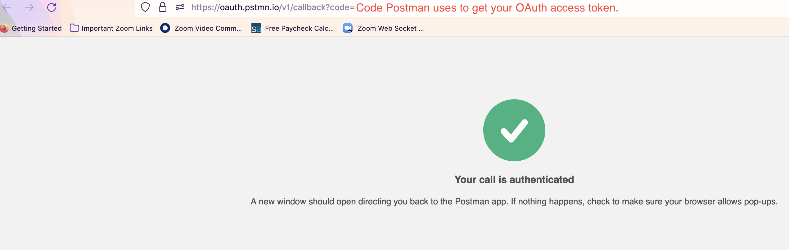 At the same time, you’ll see a confirmation message within the Postman client saying that the request was successful. It closes in <5 seconds and will be replaced with the following page: