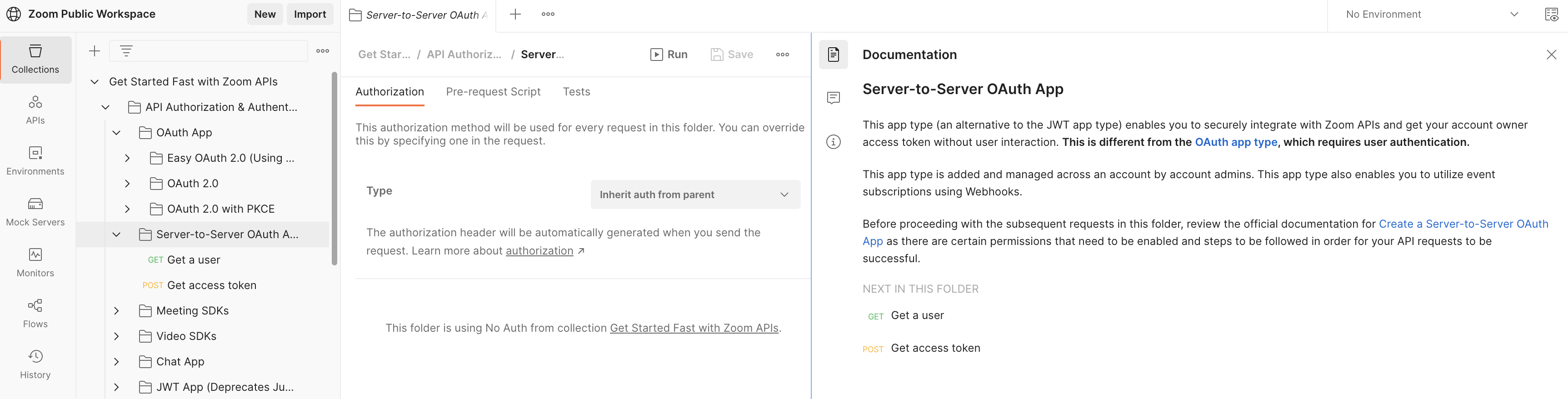 To get started, take a look at our Postman Workspace for guidance on Server-to-Server OAuth: Create meeting link on behalf of external users by hosting OAuth Account Level APP - #3 by hmshah.1984