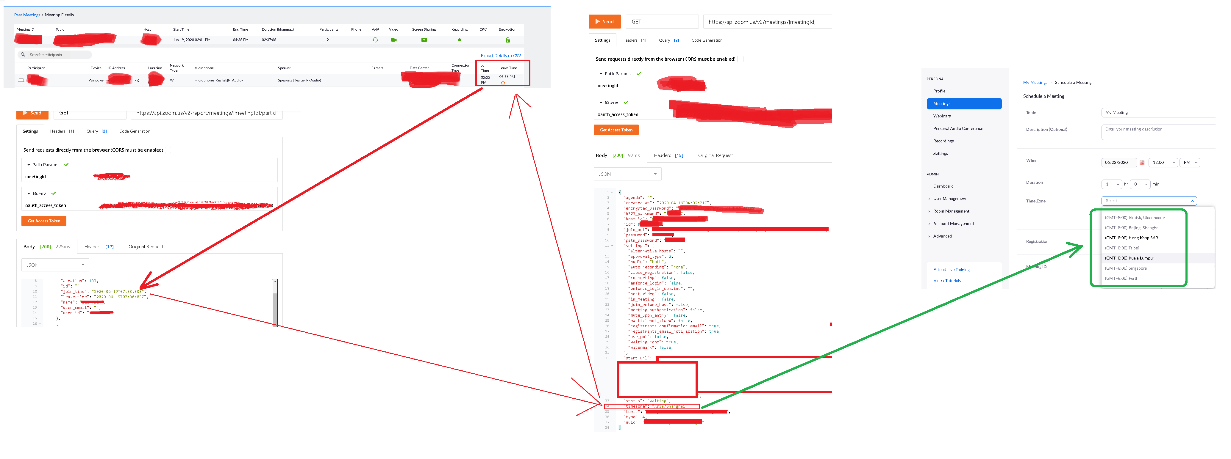 For example, as attached in the screen, according to the API " https://api.zoom.us/v2/meetings/{meetingiId}", the meeting TimeZone is “Asia/Shanghai”, means GMT+8
