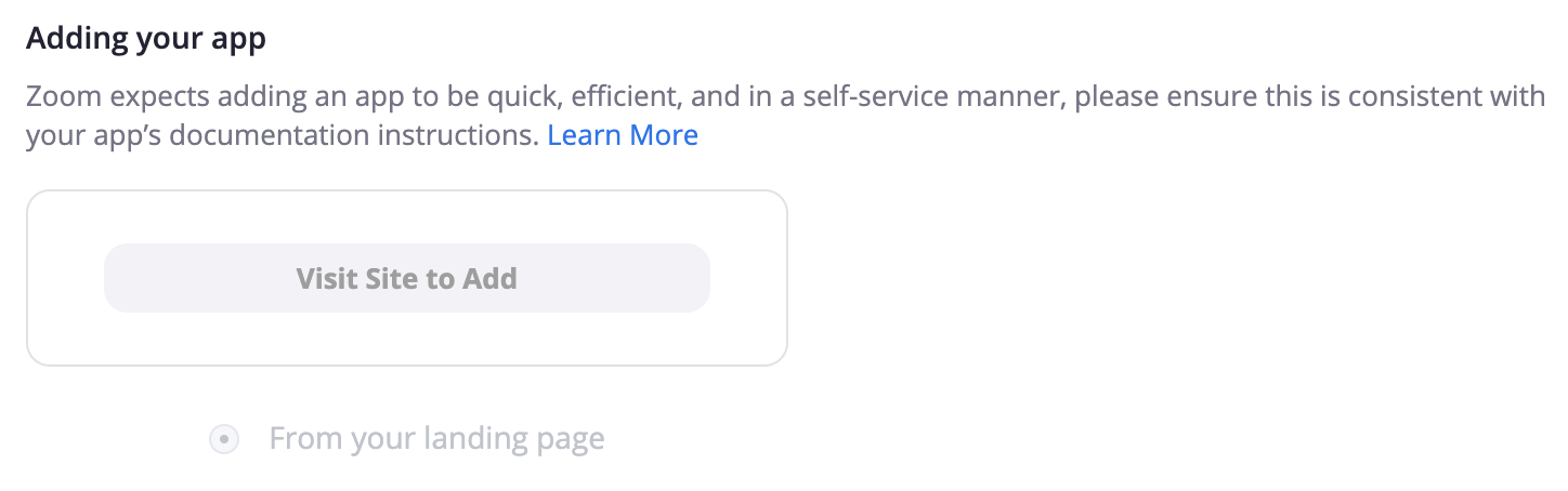 However, within the app configuration no such option appears. There is an “Adding your app” section, which appears with only a grayed out radio button: