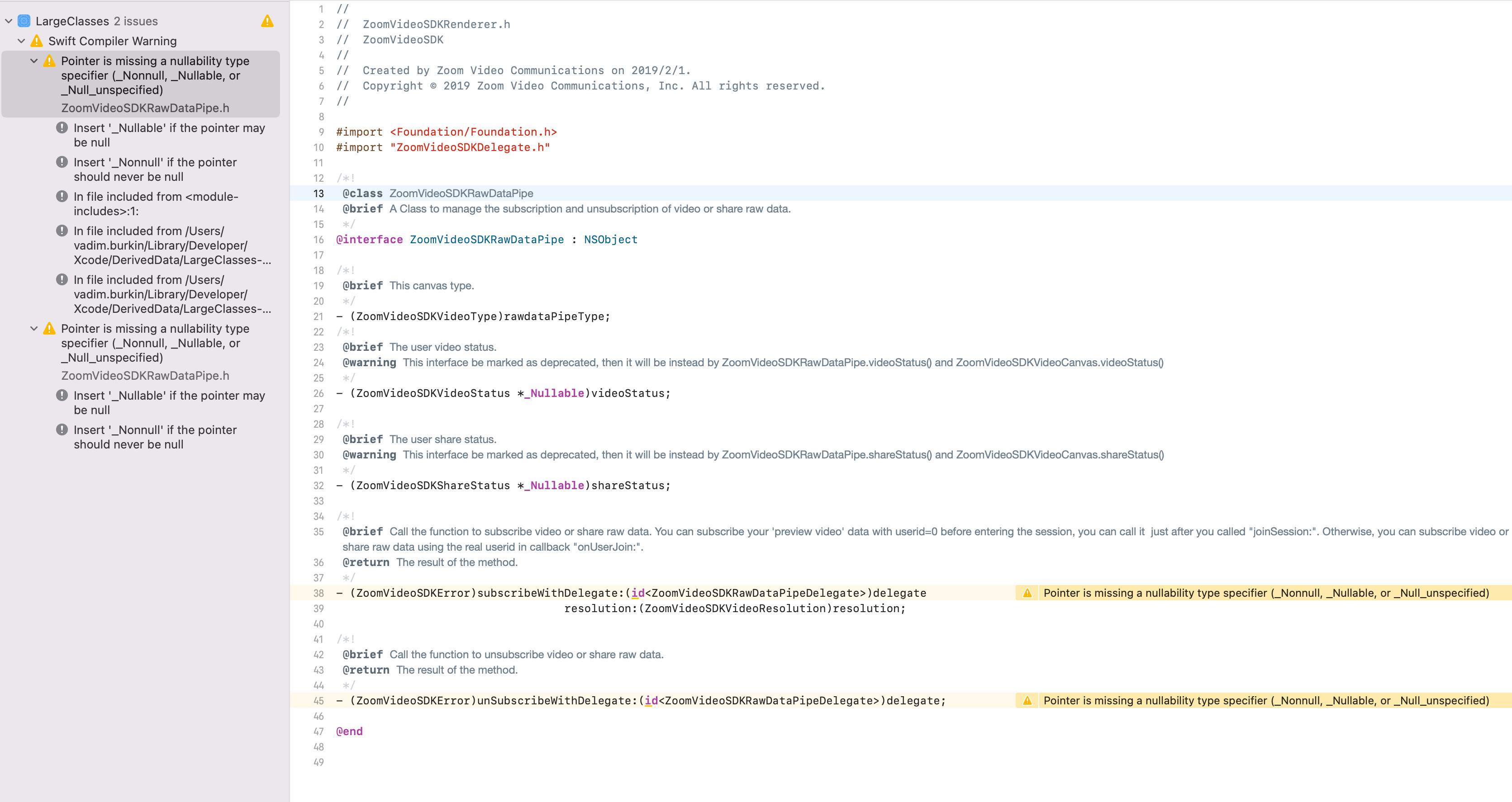 I added ZoomVideoSDK framework to my project. After I build it I get a couple of warnings from the compiler. It says: