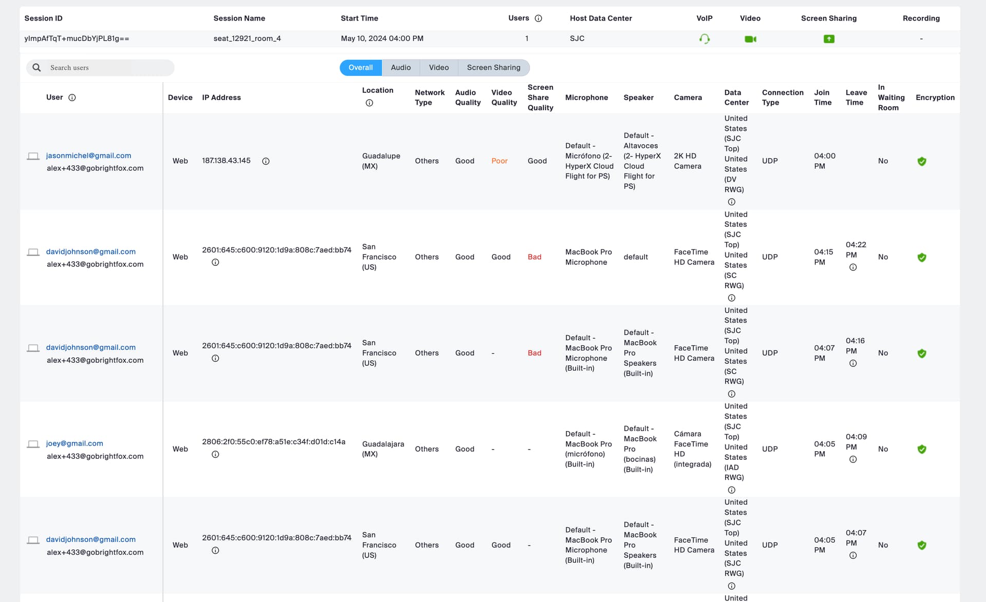 Checking on the logs of the sessions we found out that he has the “Screen share quality” as bad, but we don’t know if it onlymeans that when he shares his screen, the quality is bad for other viewers, or that he can’t see the screen share too