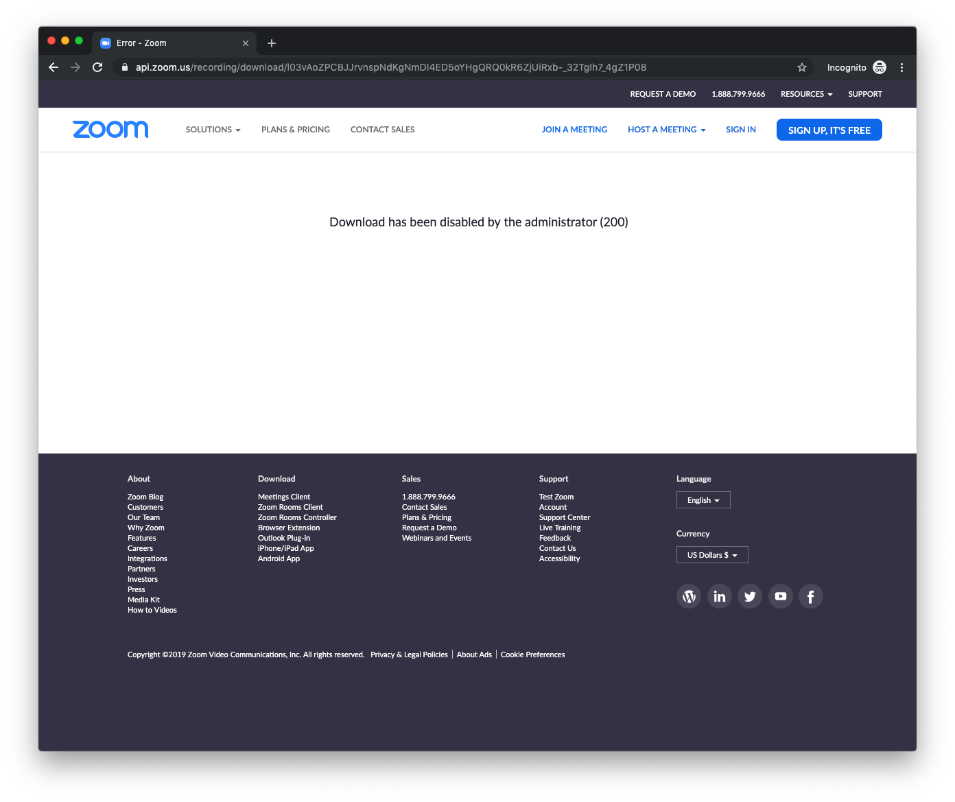 As it stands now, it looks like we have to assume everything is okay, wait until a customer wants to us to download one of their recordings then try the download link to see if it works. If it doesn’t, we need to show an error and request that they change the setting, which may or may not be the cause of the error (since our backend isn’t currently configured to parse out and look for the “disabled by administrator” text we can’t be sure if the problem is in their settings or a Zoom problem such as the original thread above).