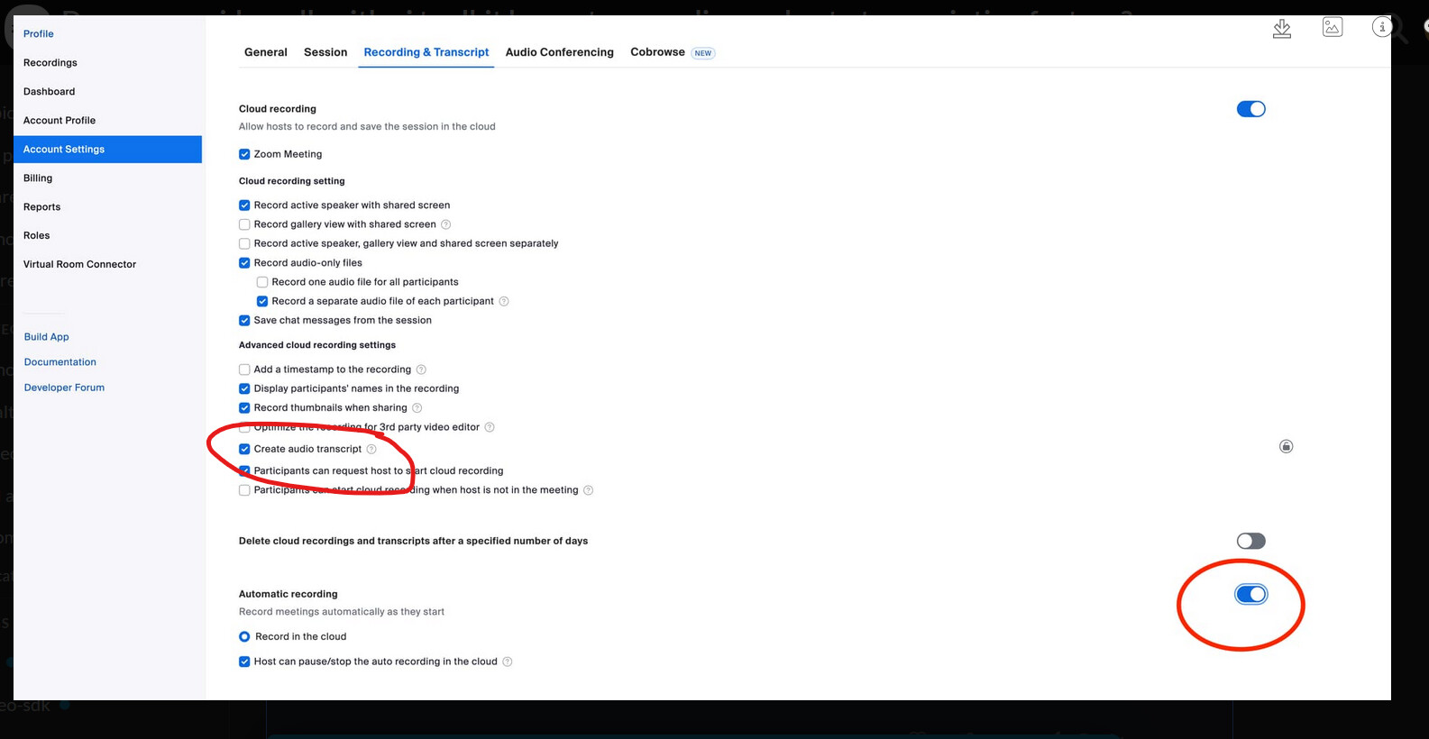 I am looking for some help to enable cloud recording transcripts on my Video SDK Account.