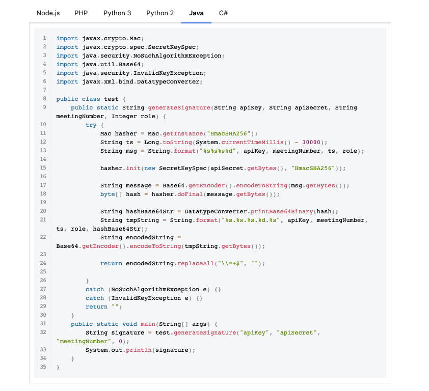 hasher.init(new SecretKeySpec(ZOOM_API_SECRET.getBytes(), "HmacSHA256"));