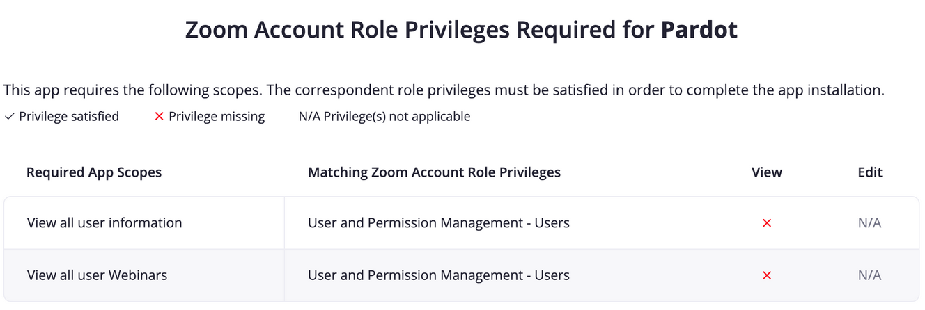 - I am taken to Zoom Account Role Privileges Required for Pardot where the permissions needed are shown.
