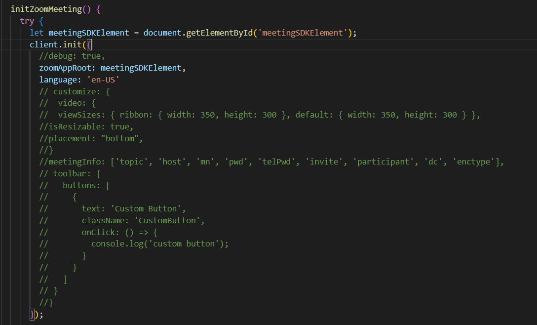 The problem is that when you create a component and initiate zoom with client.init() function it works OK but when you close the component there’s no function to kill Zoom so when you reopen/create a new component and initiate Zoom again with client.init() you’ll get an error and won’t be able to use it again. The error will show the first property you add to “customize”. Could anybody find a fix?