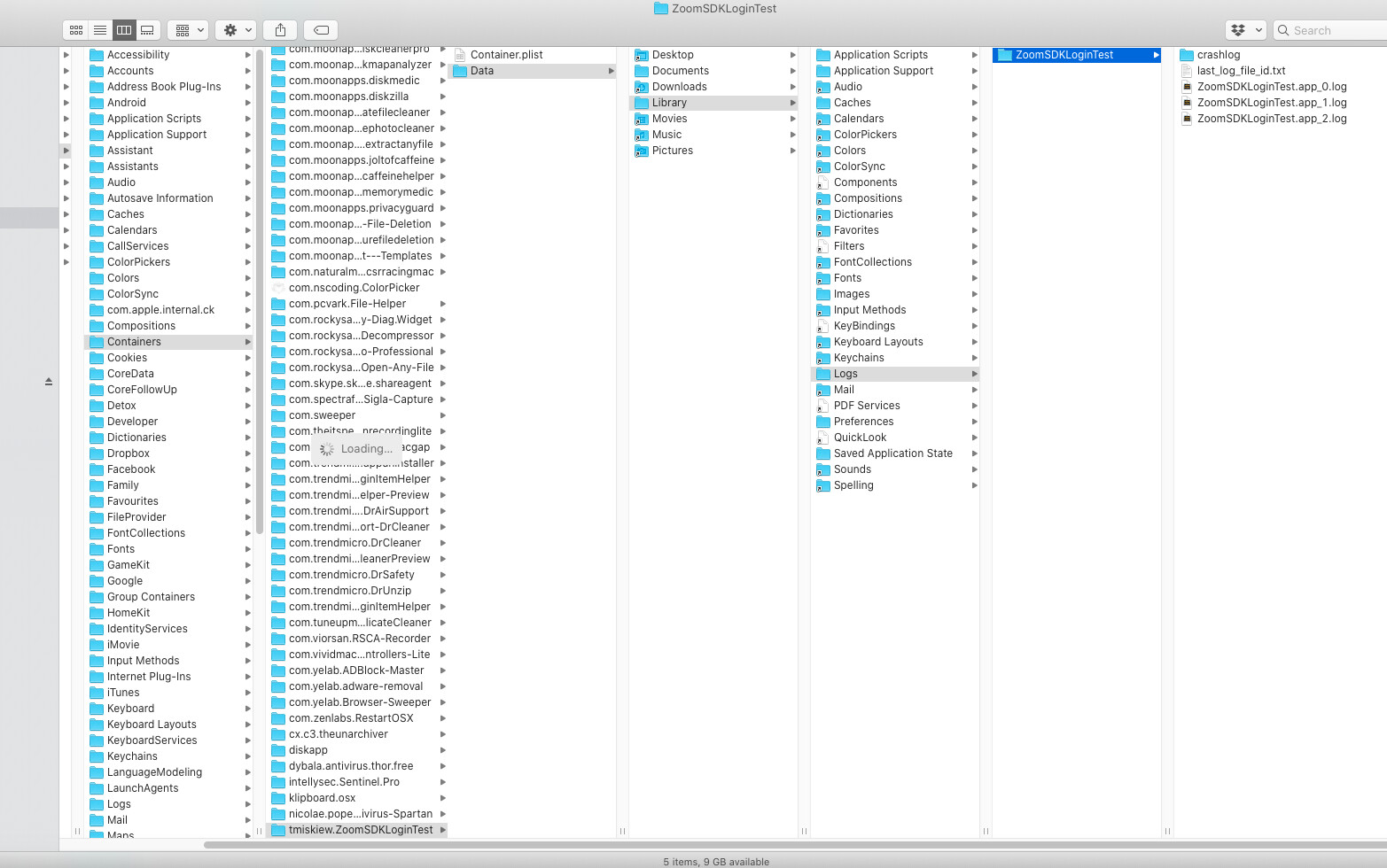 ~/Library/Containers//Data/Library/Logs/ rather than in the location you mentioned previously. Can you share the location and content of your folder? Here’s what I got